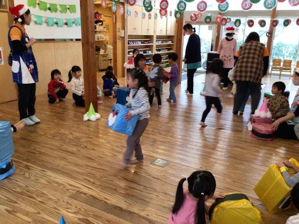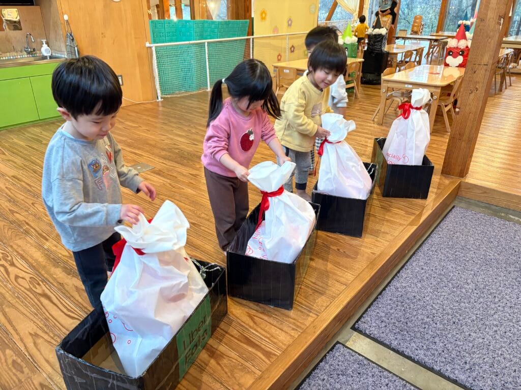 さかのぼること、12月の初旬・・・園庭に赤い大きな洋服が落ちていました。子どもたちは「サンタさんの服じゃん!!」と大騒ぎ!「サンタはいまごろ・・・♪」の歌に合わせて、洋服を洗濯したり、大きな袋を作ったりと「いつ、取りに来るかなぁ?」とドキドキしていました。