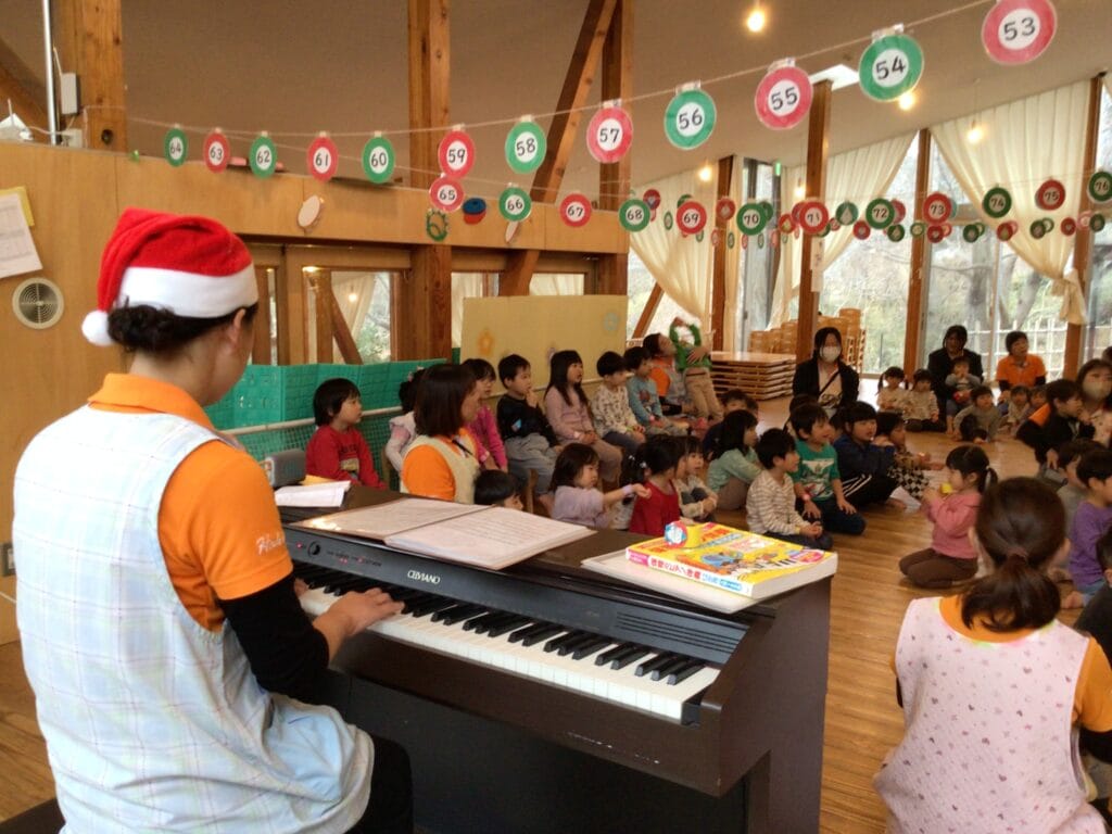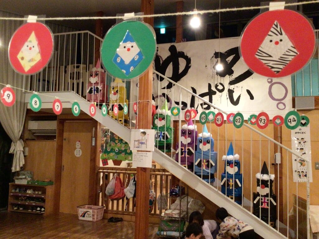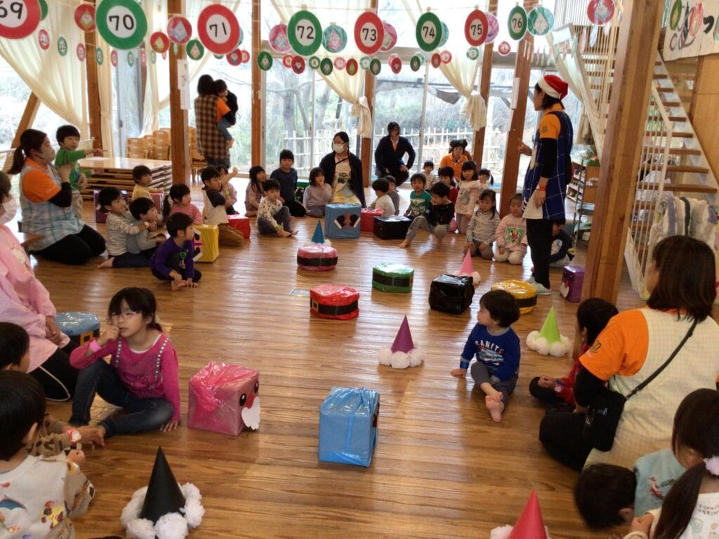 今回のはくすい保育園には素敵な手作りガーランドも登場しました。これは絵本の「100にんのサンタクロース」にちなんで、色も柄も全て異なる100柄のサンタクロースで、1から100までの数字を辿って楽しんでいました!