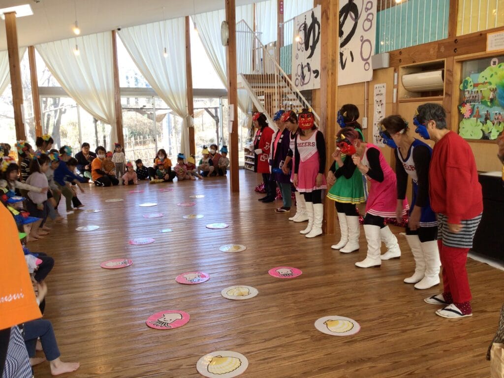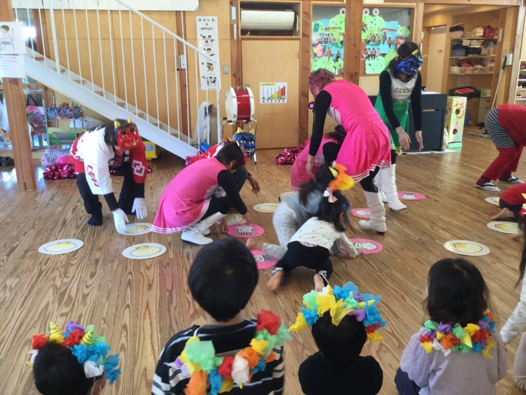 「東京ブギウギ♪」や「鬼のパンツ♪」の曲に合わせて鬼も子どもたちもみんなで体を動かして、0歳児から2歳児は「鬼と玉入れ」、3歳児は鬼とジャンケン列車、4歳児は「鬼とオセロゲーム」、5歳児は「ジャンケン列車」と「オセロゲーム」をそれぞれ楽しみました。