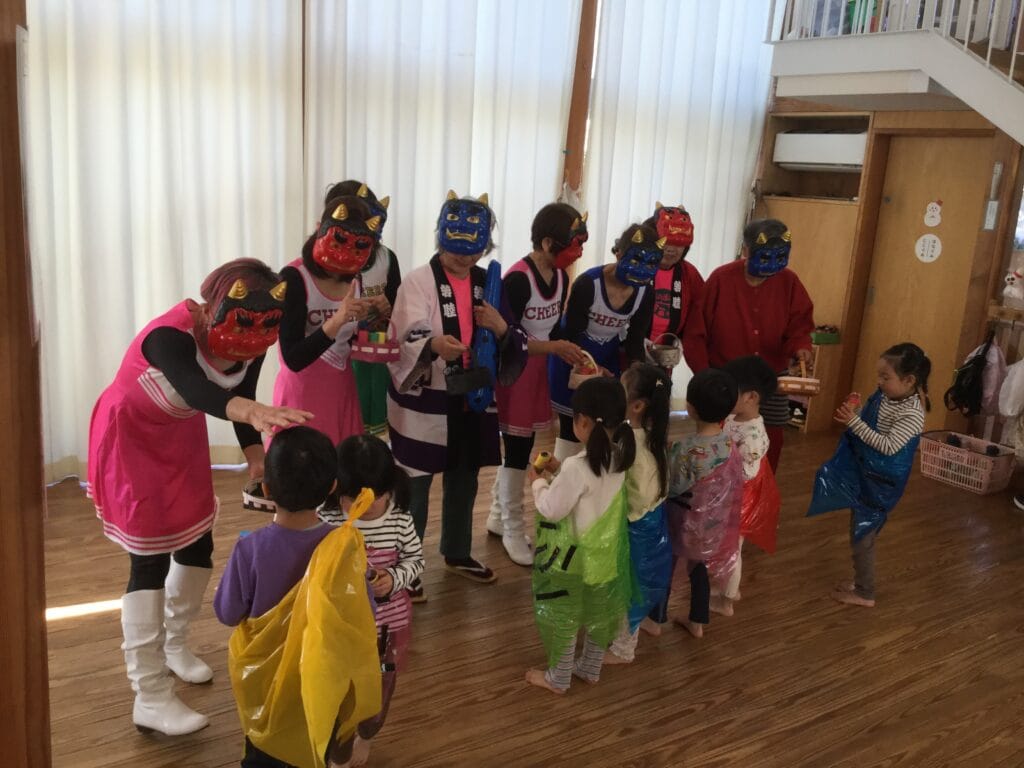4歳児VS鬼軍団・・・子どもたちの勢いに押されていました!そらぐみの勝ち!!