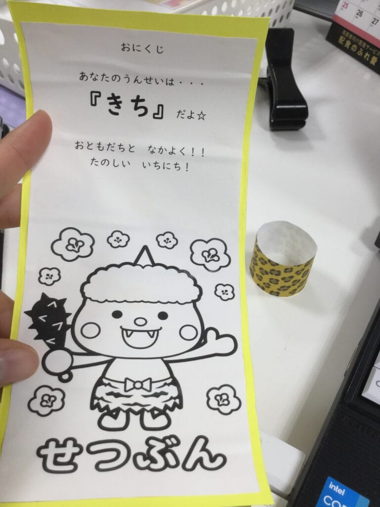 最後は鬼たちから「おみくじ」ならぬ”おにくじ”をもらいました♪鬼さん!また、遊びに来てね!!