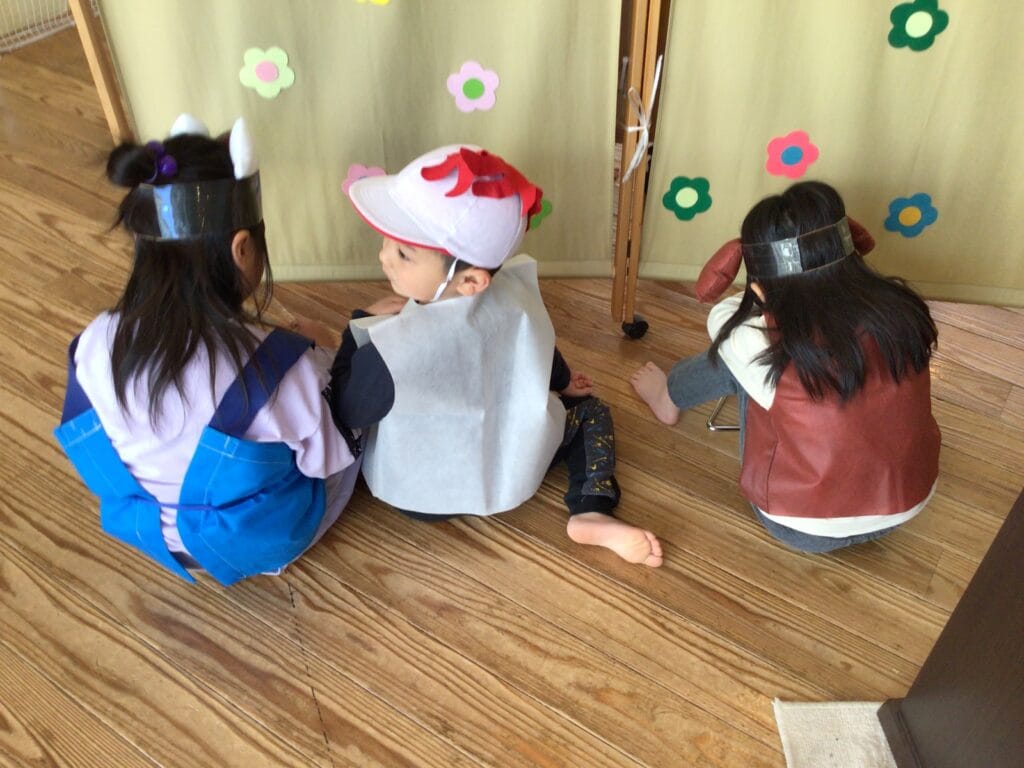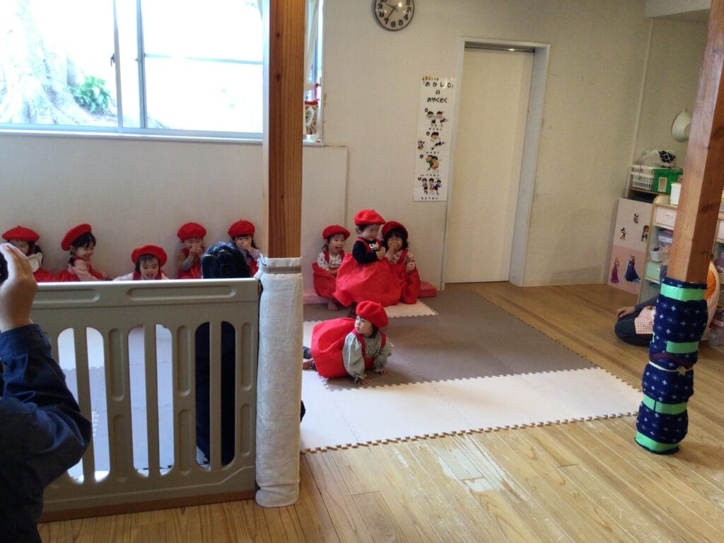 絵本「だるまさんが」に見立てて・・・子どもたちは赤い衣装に身を包み♪