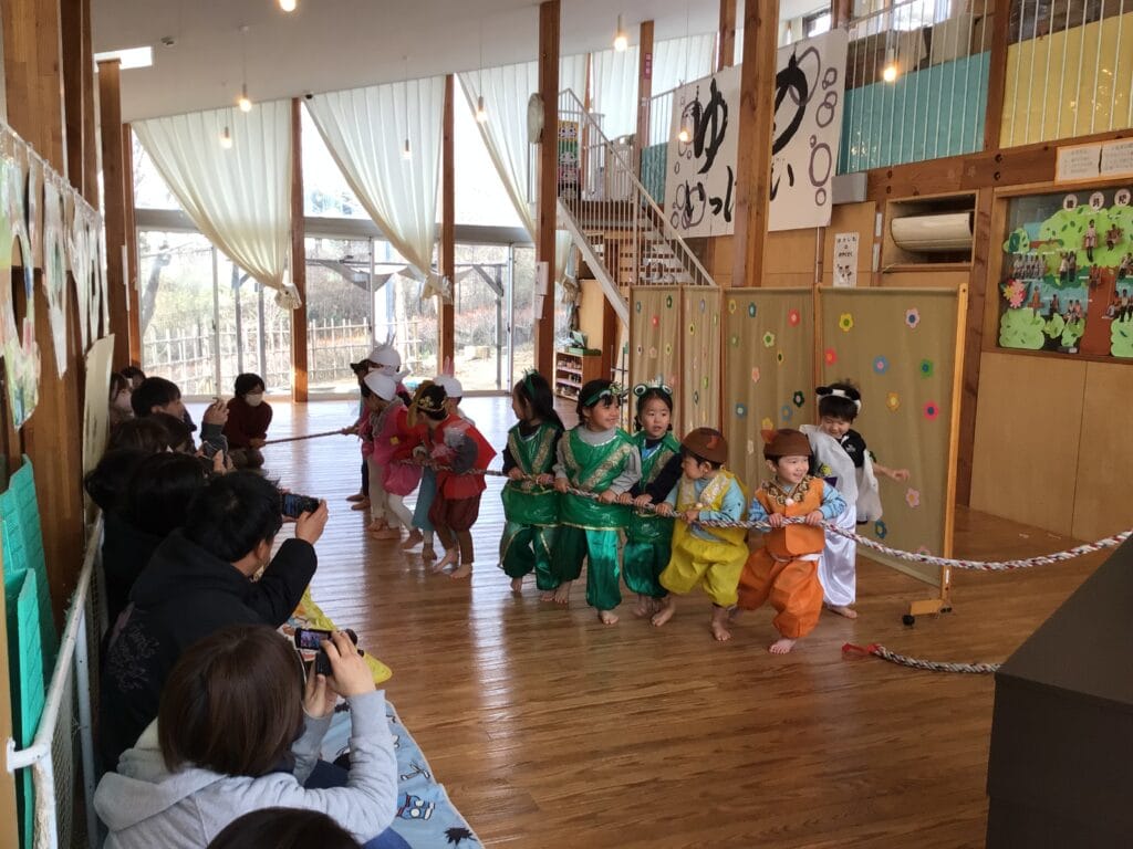 今年度のはくすい保育園の発表会を保育参観形式で実施しました。日頃から各クラスで楽しんでいるお話や出し物を保護者の皆さんと共有する場として、保護者参加型で盛り上がりました。
