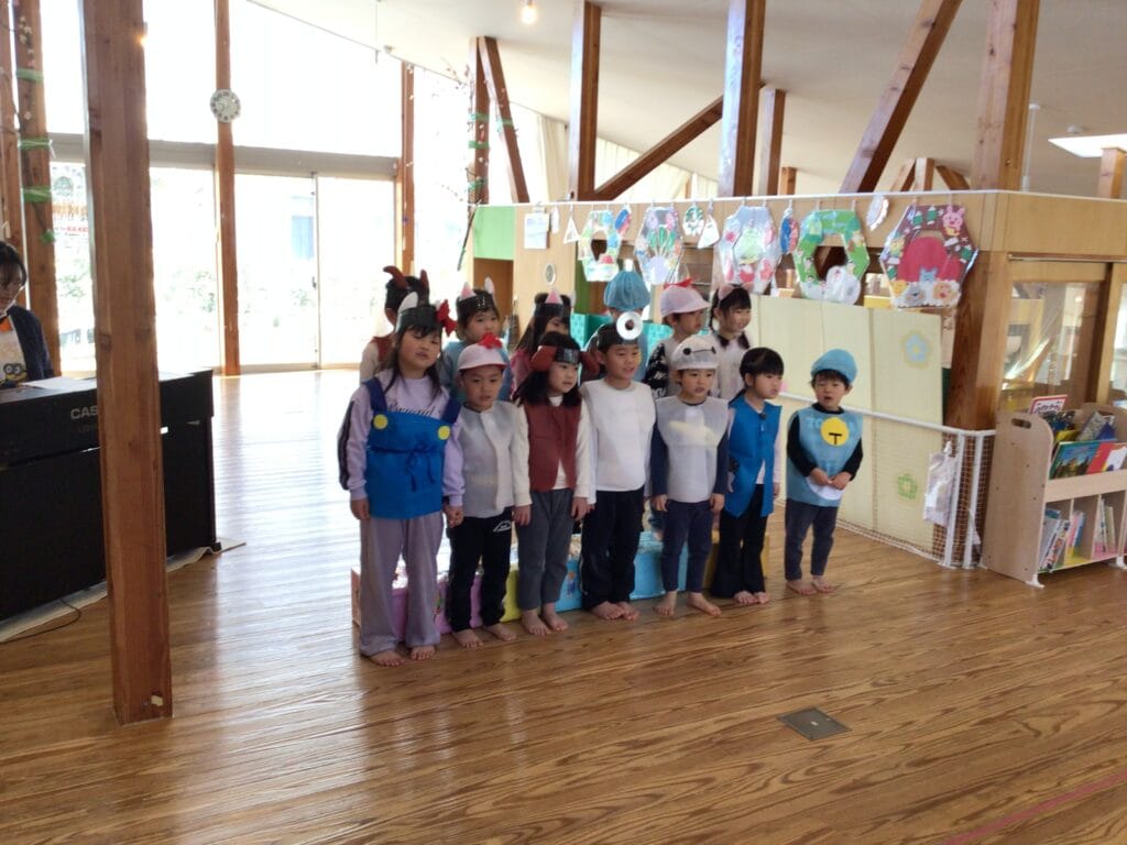 ほしぐみは「おおきなかぶ」の劇あそびと「山の音楽家」の楽器あそびを披露しました。劇あそびに登場するのは様々な動物たち!子ども一人ひとりが「これにする!」「この服にする!」と選び準備を進めてきました。