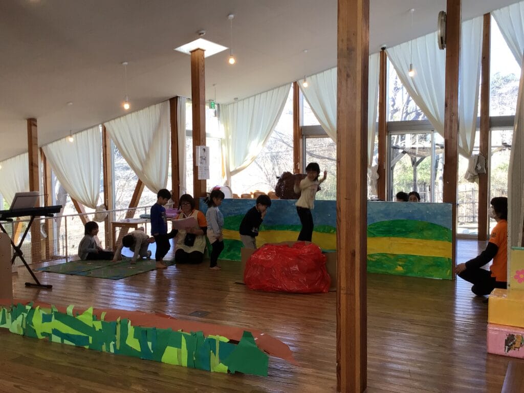 絵本「きょだいな きょうだいな」をテーマに劇あそびを展開した5歳児。セリフと動きを考え、劇に必要な小道具、大道具を自分たちで製作し、8人で力を合わせて準備をしてきました!当日も必要なものは自分たちで用意をする姿はさすがでした!!
