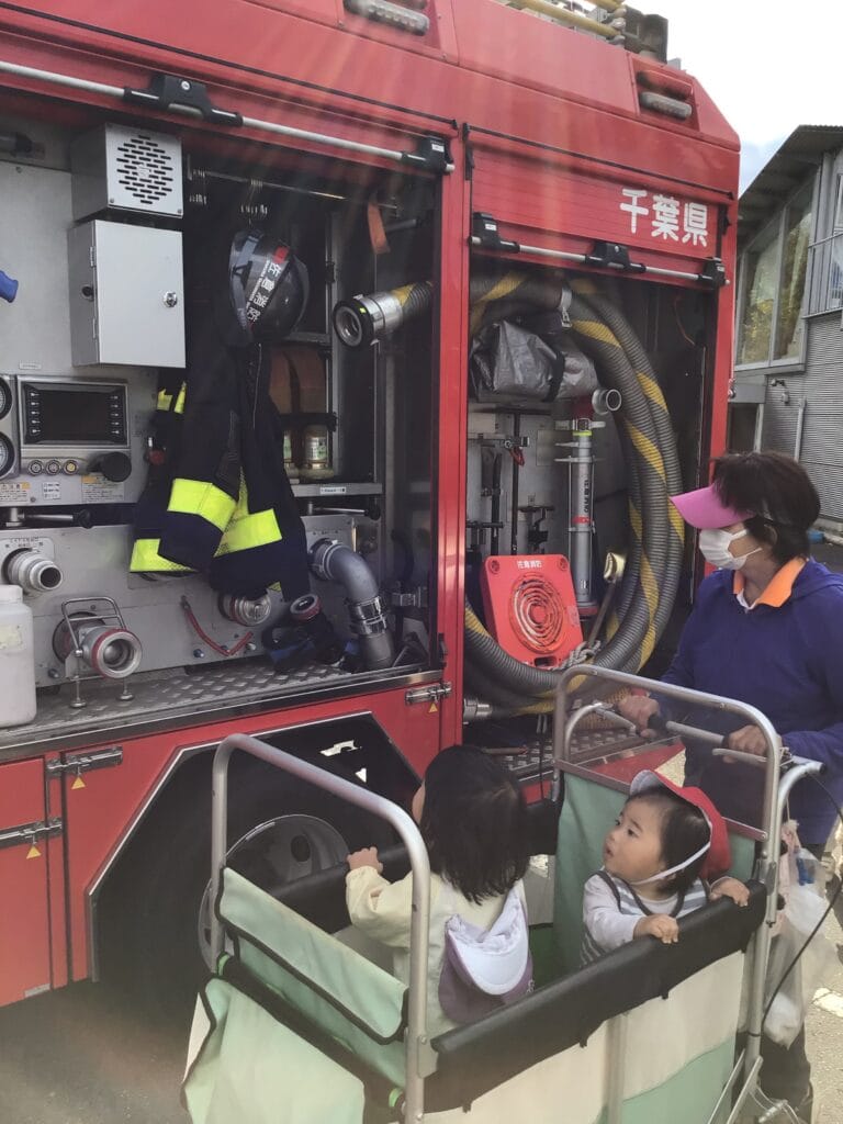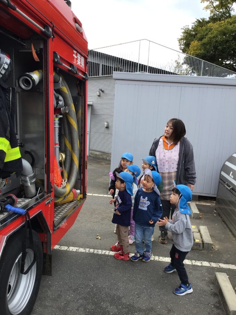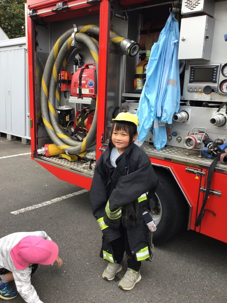 消防車の中を見せてもらったり、防火衣を着せてもらったり…貴重な体験をさせていただきました。